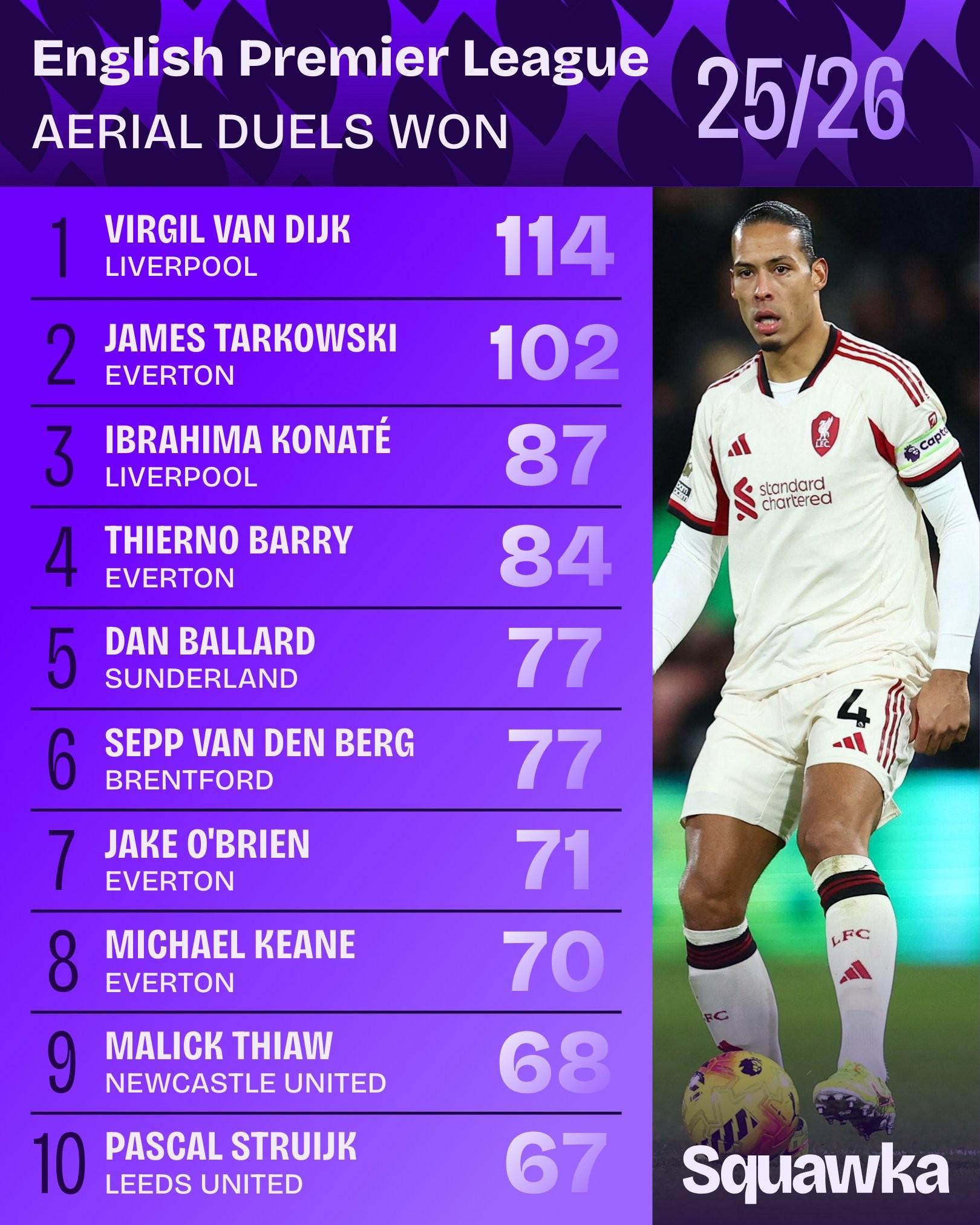 开云官网-本赛季英超赢得空中对抗排名:范戴克第一,塔尔科夫斯基次席